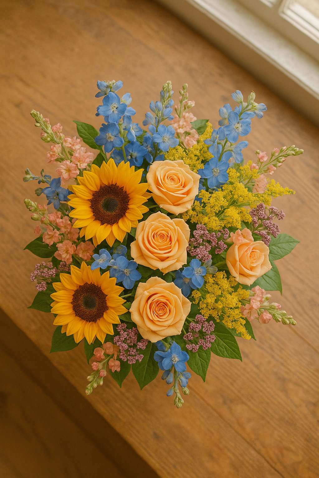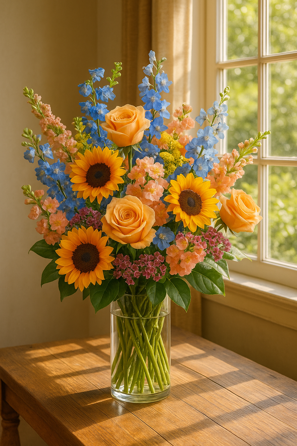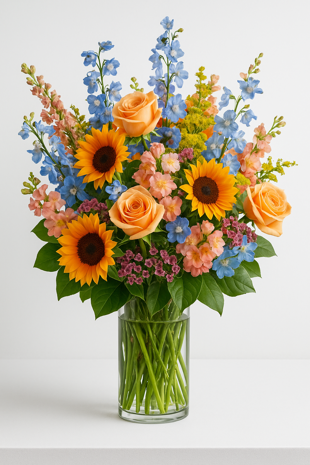 Brighten their day with a radiant arrangement full of warmth, charm, and cheerful energy. This design is perfect for celebrating life’s joyful moments, offering a vibrant touch to any room or occasion.