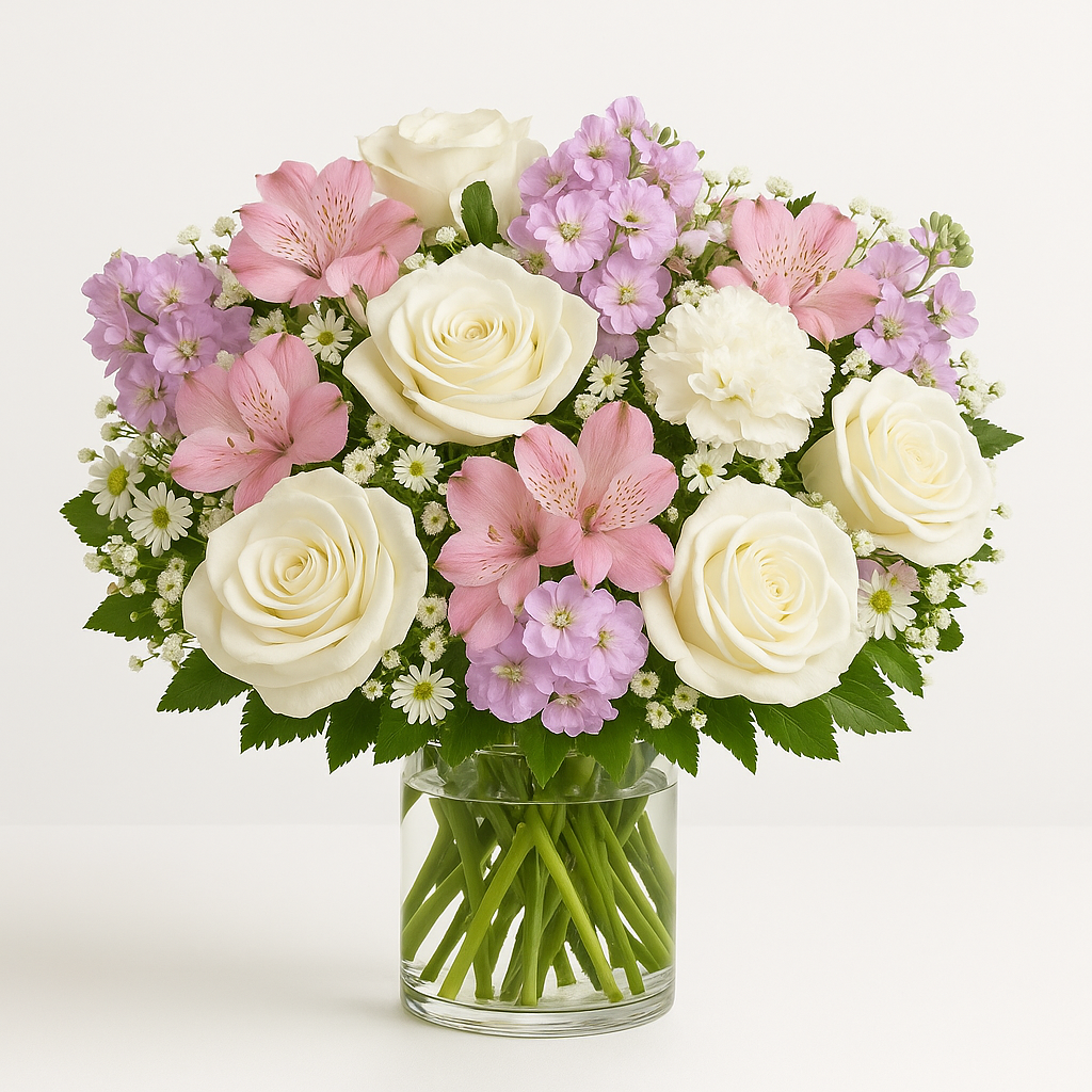 Delicate and uplifting, this arrangement is the perfect gesture to celebrate life's most heartfelt moments. With soft hues and graceful textures, it adds elegance and charm to any space.