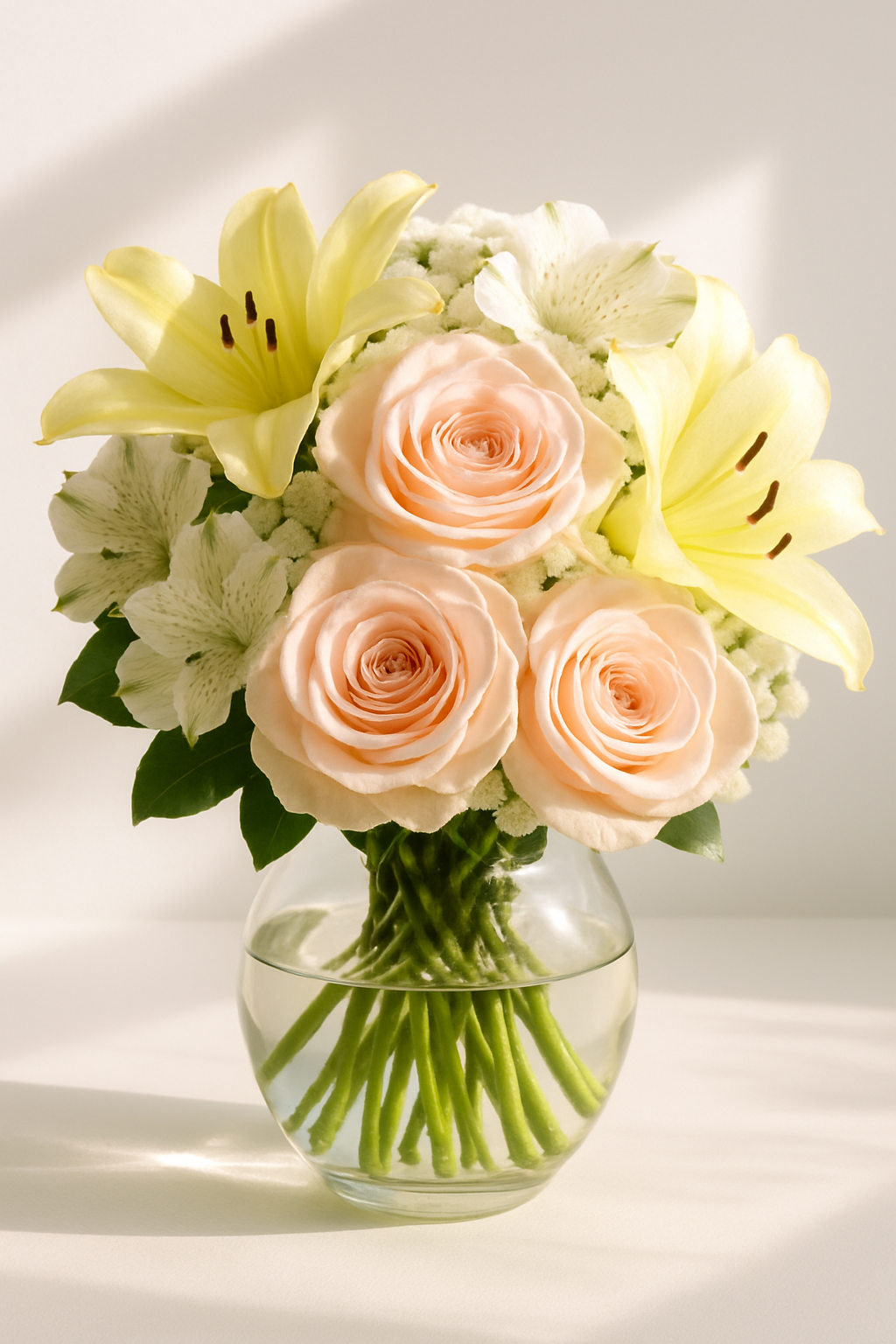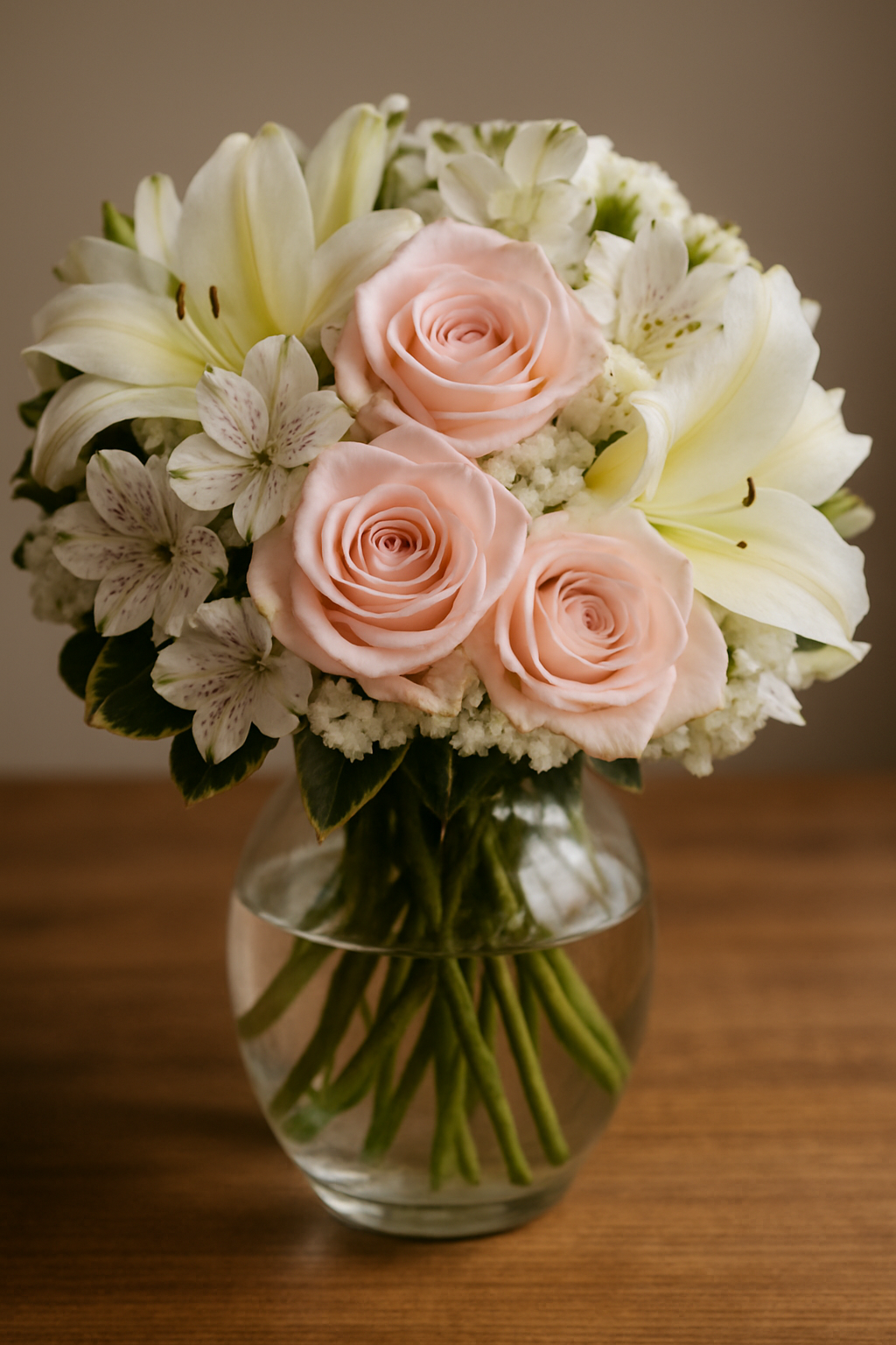 A tender and graceful arrangement designed to bring an air of timeless beauty to any room. Delicate blooms in soft, creamy hues are artfully gathered in a clear vase, offering a perfect expression of elegance and charm for any occasion.