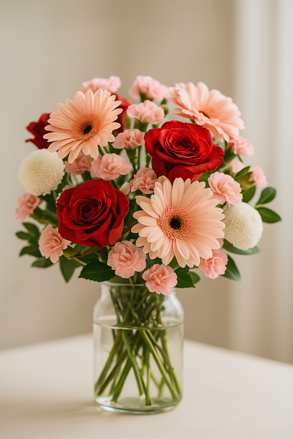 Rosecloud is a delicate harmony of blush gerberas, deep red roses, soft pink carnations, and snowy white poms — all artfully arranged to evoke the feeling of drifting through a sunset-lit cloud. Gentle yet vibrant, it’s a bouquet that whispers love, comfort, and quiet elegance.