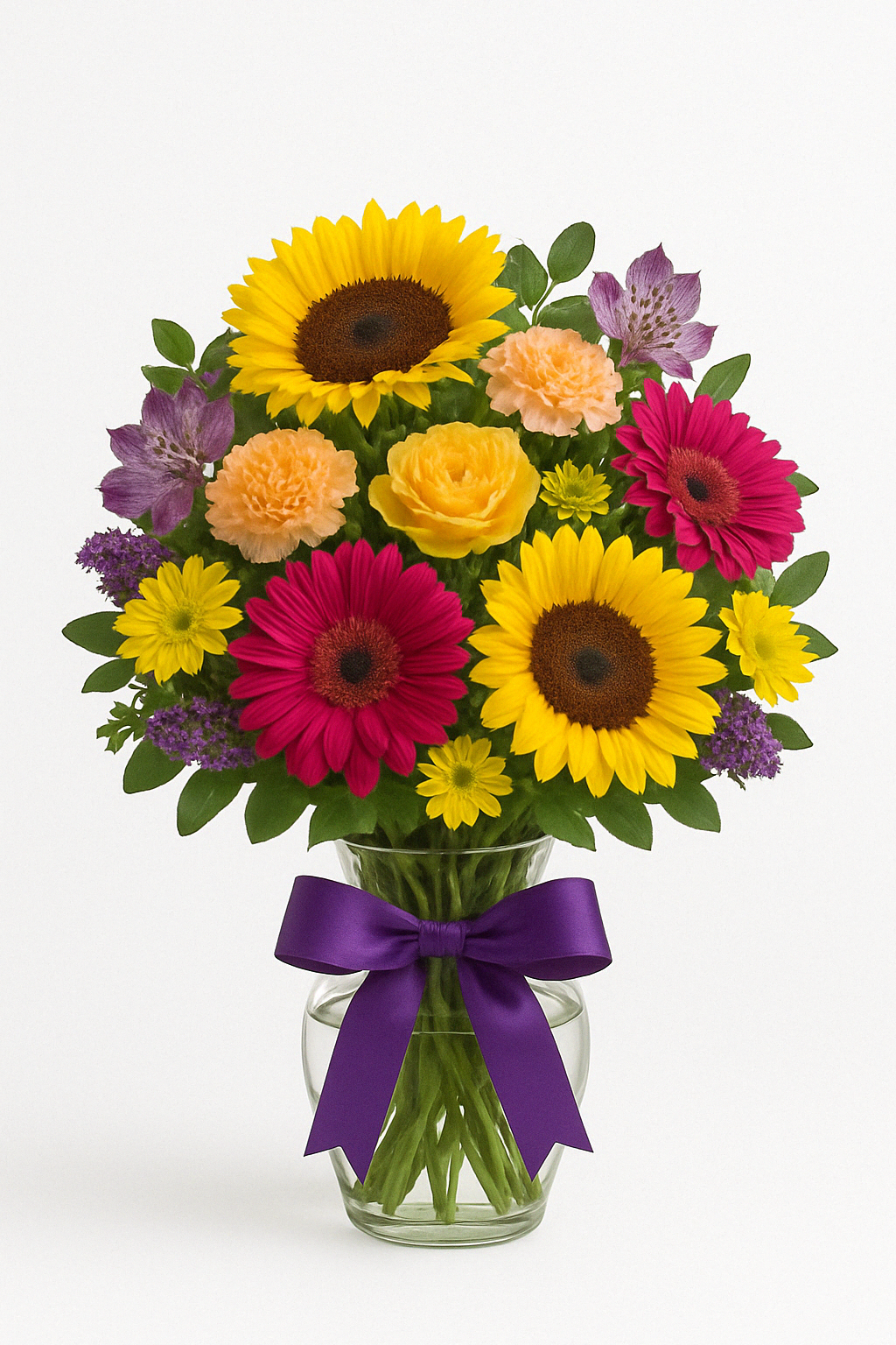 Bursting with joy, this cheerful bouquet features sunny sunflowers, bold gerbera daisies, playful carnations, and vibrant alstroemeria — all wrapped in lush greenery and tied with a purple satin bow. A perfect birthday surprise to brighten anyone’s day with warmth and color!