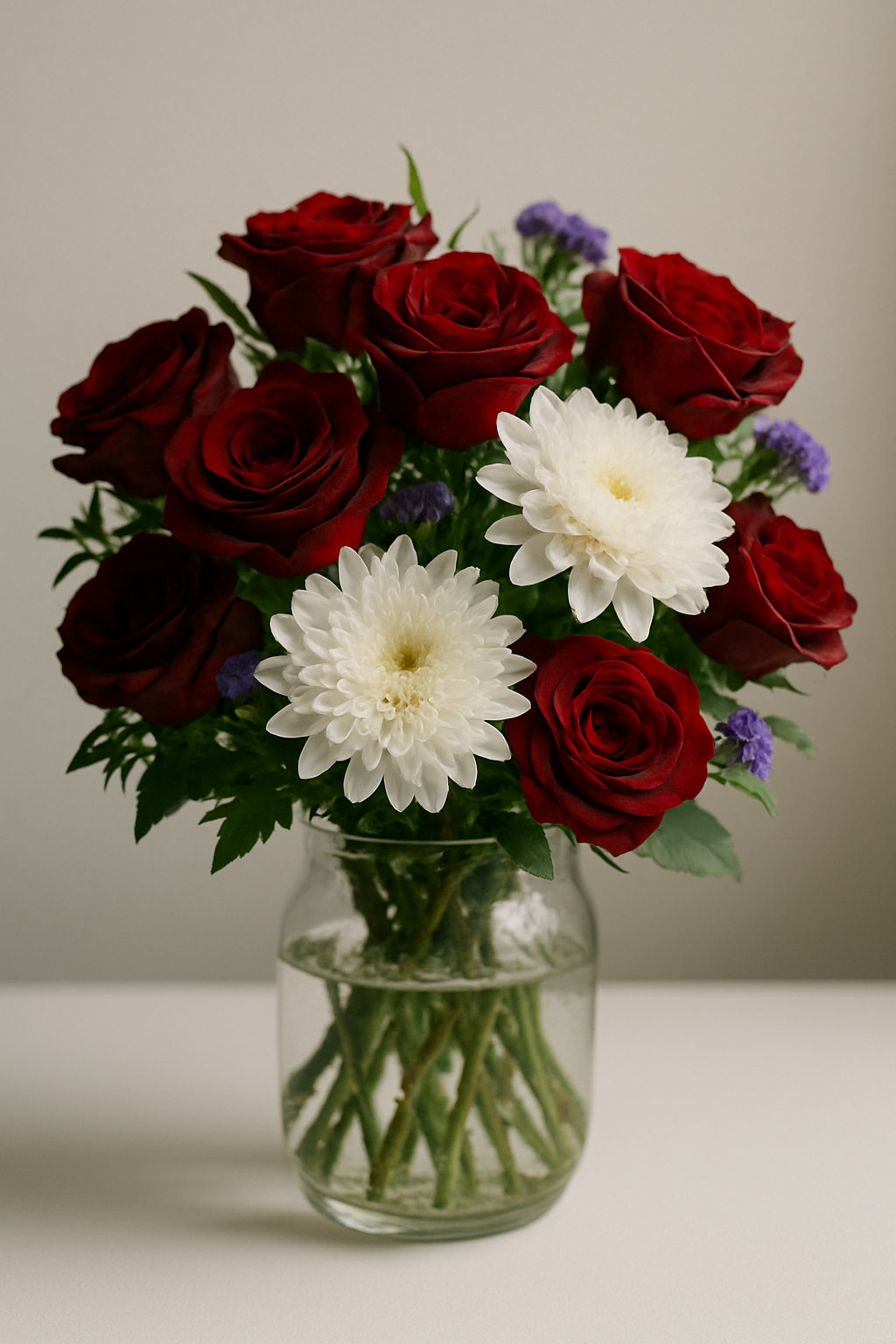 Twilight Bloom is a graceful arrangement of deep red roses, crisp white chrysanthemums, and delicate purple statice, gathered in a clear glass vase. Bathed in soft natural light, this bouquet captures the quiet beauty of evening light filtering through a room—elegant, calm, and effortlessly timeless.